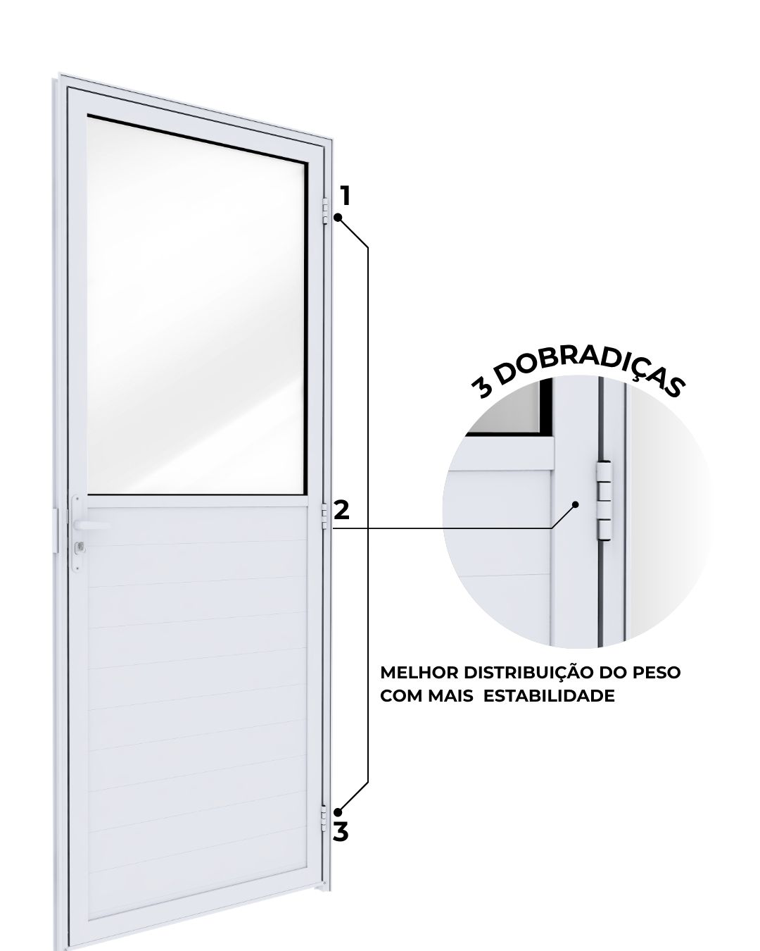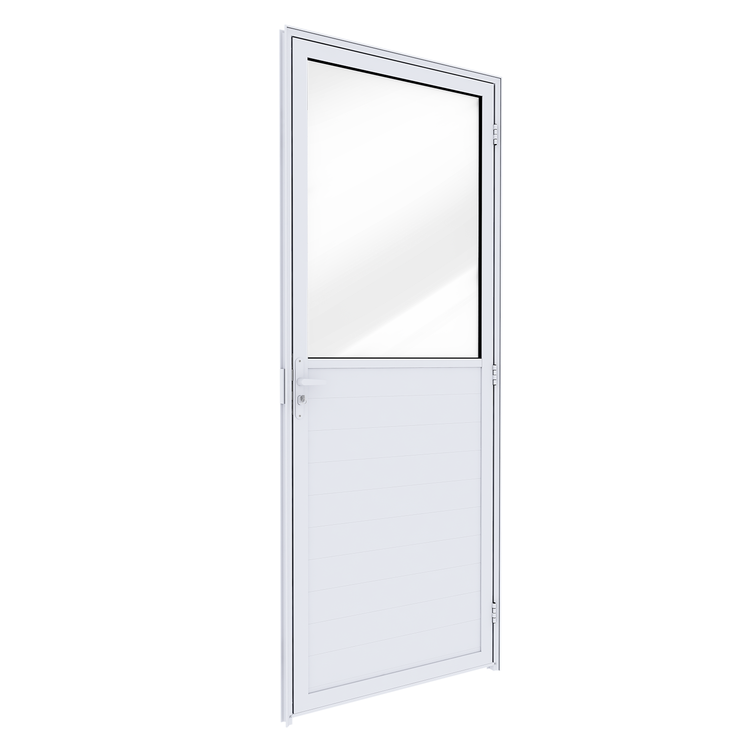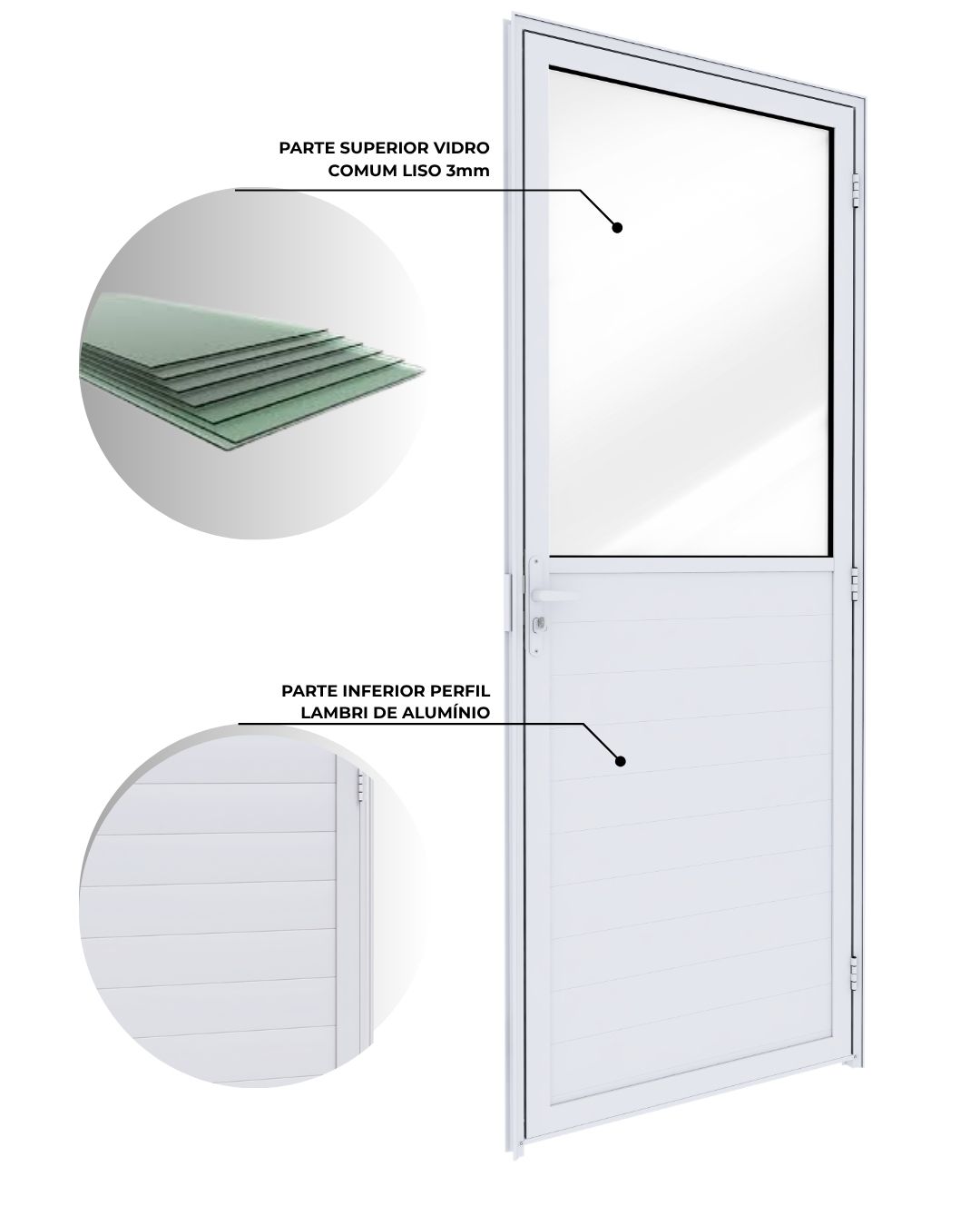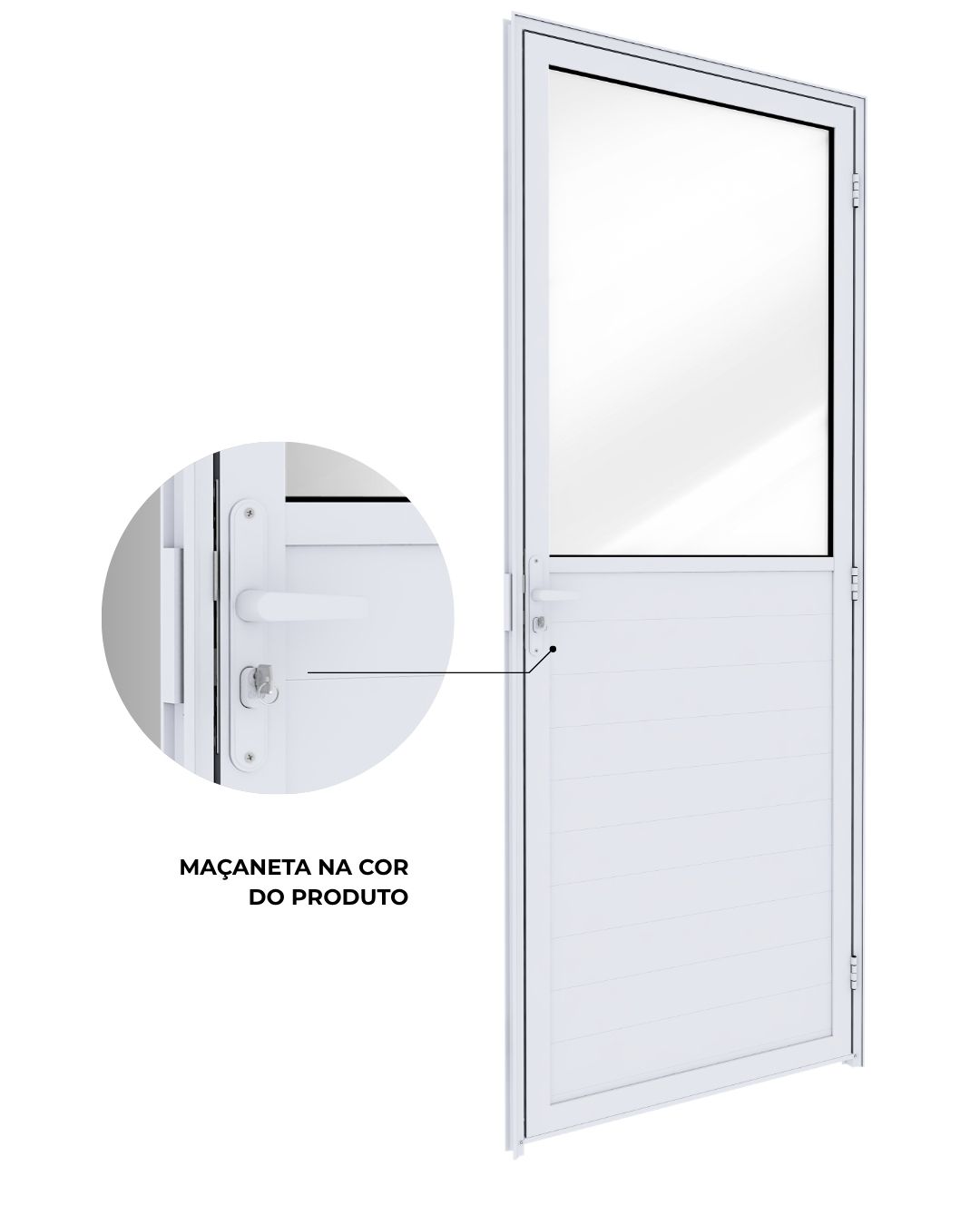 Ideal para lavanderias, cozinhas e corredores, esta porta combina o painel em lambri, que transmite sobriedade e privacidade, com vidro liso incolor de 3 mm na parte superior, permitindo a entrada de luz natural e garantindo ambientes mais agradáveis e bem iluminados.