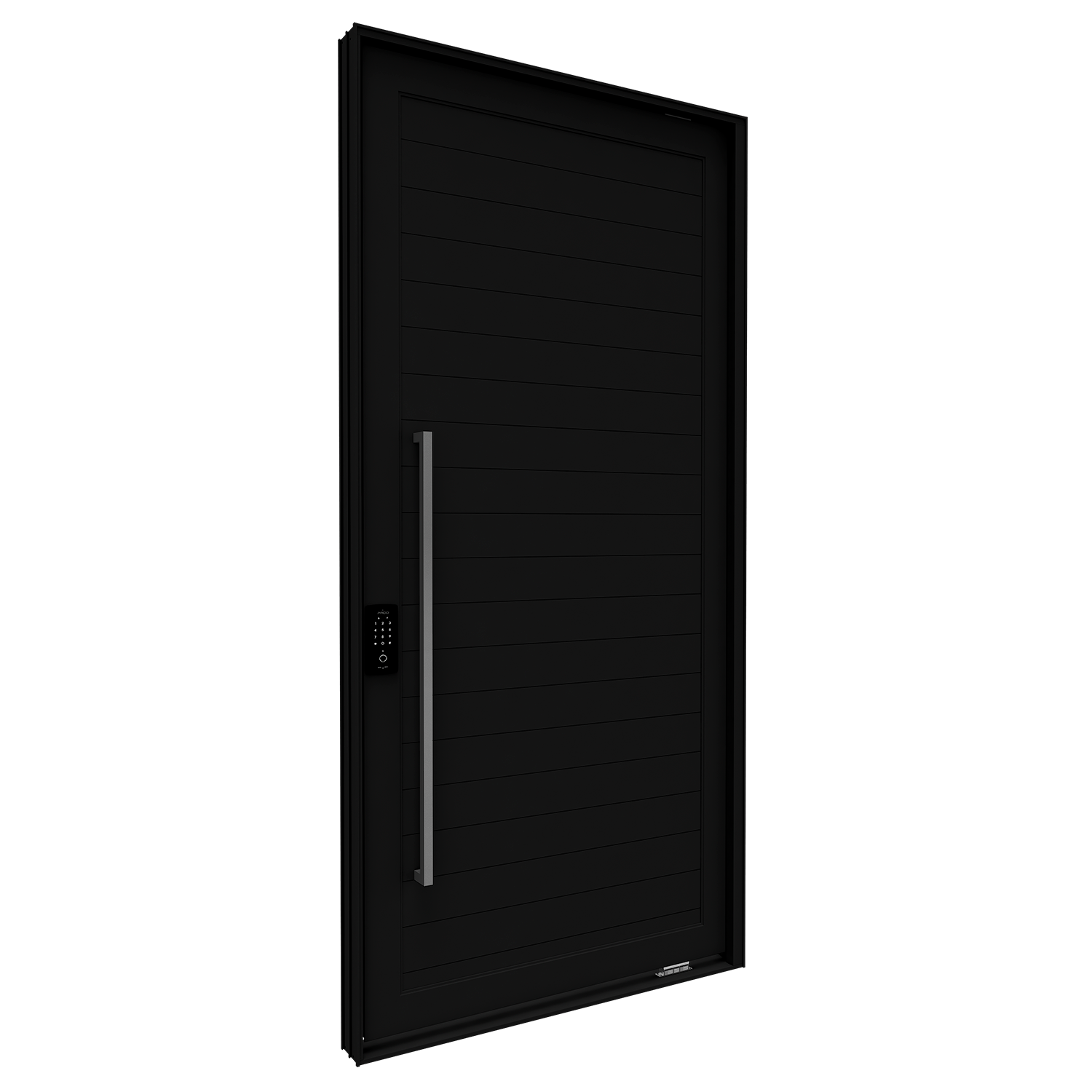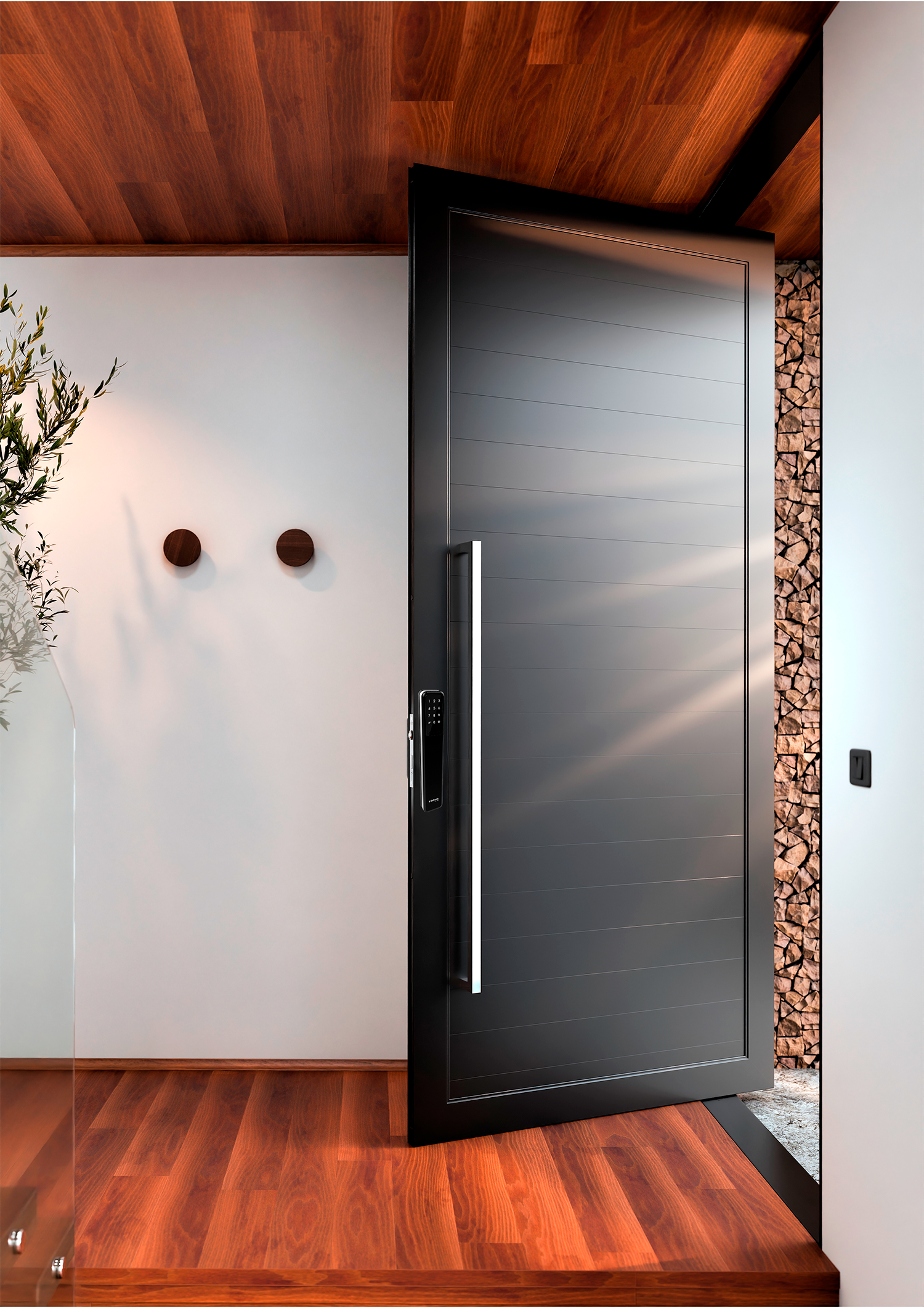 Com proporções imponentes e acabamento superior, esta porta pivotante combina tecnologia e elegância em uma peça ideal para entradas de alto padrão. Sua altura generosa destaca-se em fachadas contemporâneas.